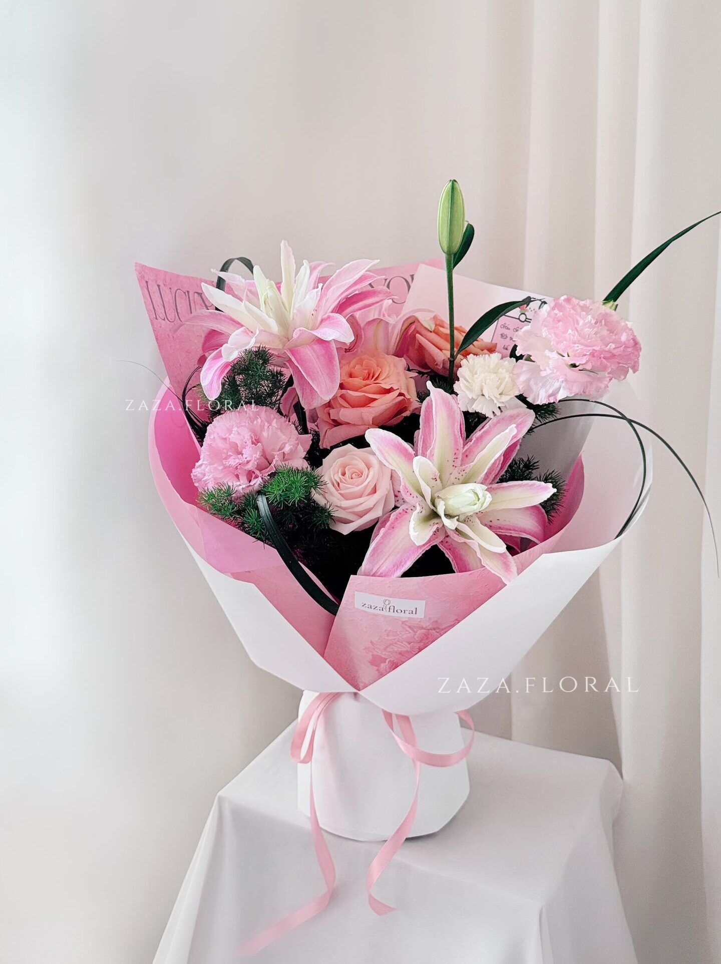 Bó hoa ly mix là sự kết hợp hài hòa giữa những bông ly hồng kiêu sa và hoa hồng pastel nhẹ nhàng, điểm xuyến bằng cẩm chướng và hoa phụ xanh mát.