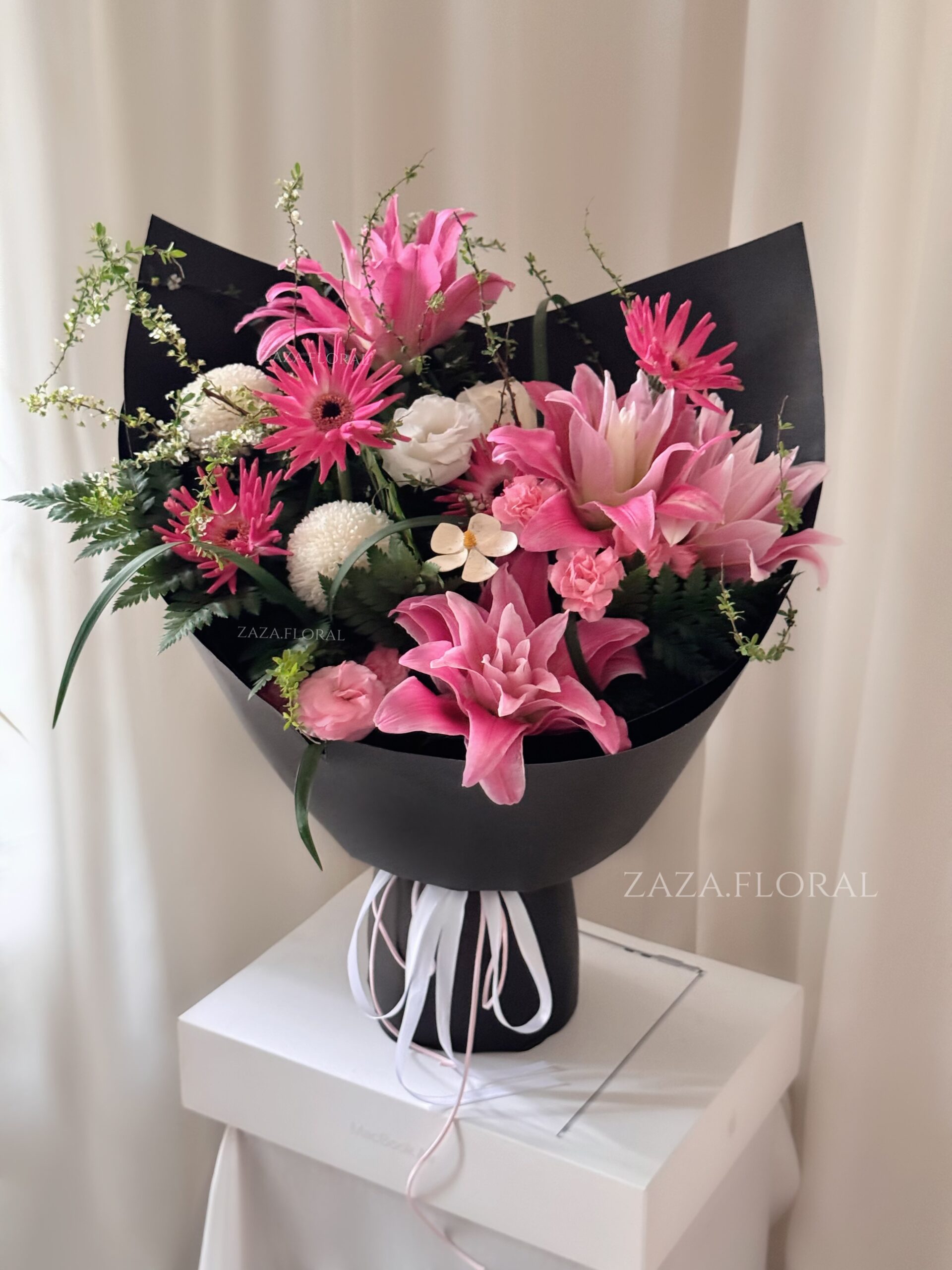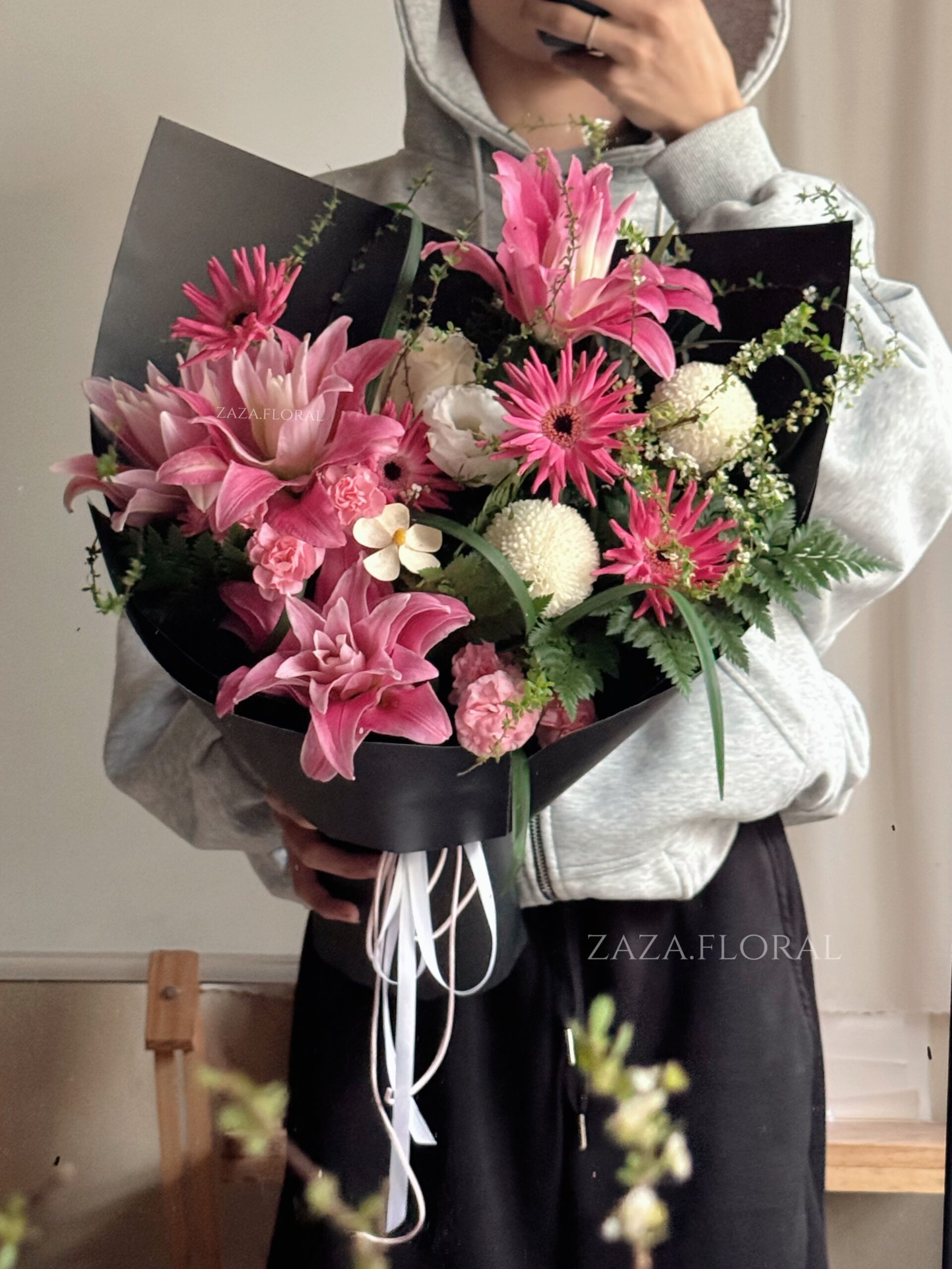 Bó hoa mang vẻ đẹp nhẹ nhàng và hiện đại, nổi bật với ly kép hồng làm điểm nhấn chính. Những cánh ly nhiều lớp bung nở mềm mại, tạo cảm giác đầy đặn và cuốn hút, tượng trưng cho sự tinh tế, nữ tính và lời chúc tốt đẹp. Cành tuyết mai được điểm xuyết khéo léo, mang lại nét thanh thoát, tự nhiên và chút rung động rất “thơ”. Đồng tiền cánh xoăn góp thêm sắc hồng tươi tắn, giúp tổng thể bó hoa trở nên sinh động và có chiều sâu.