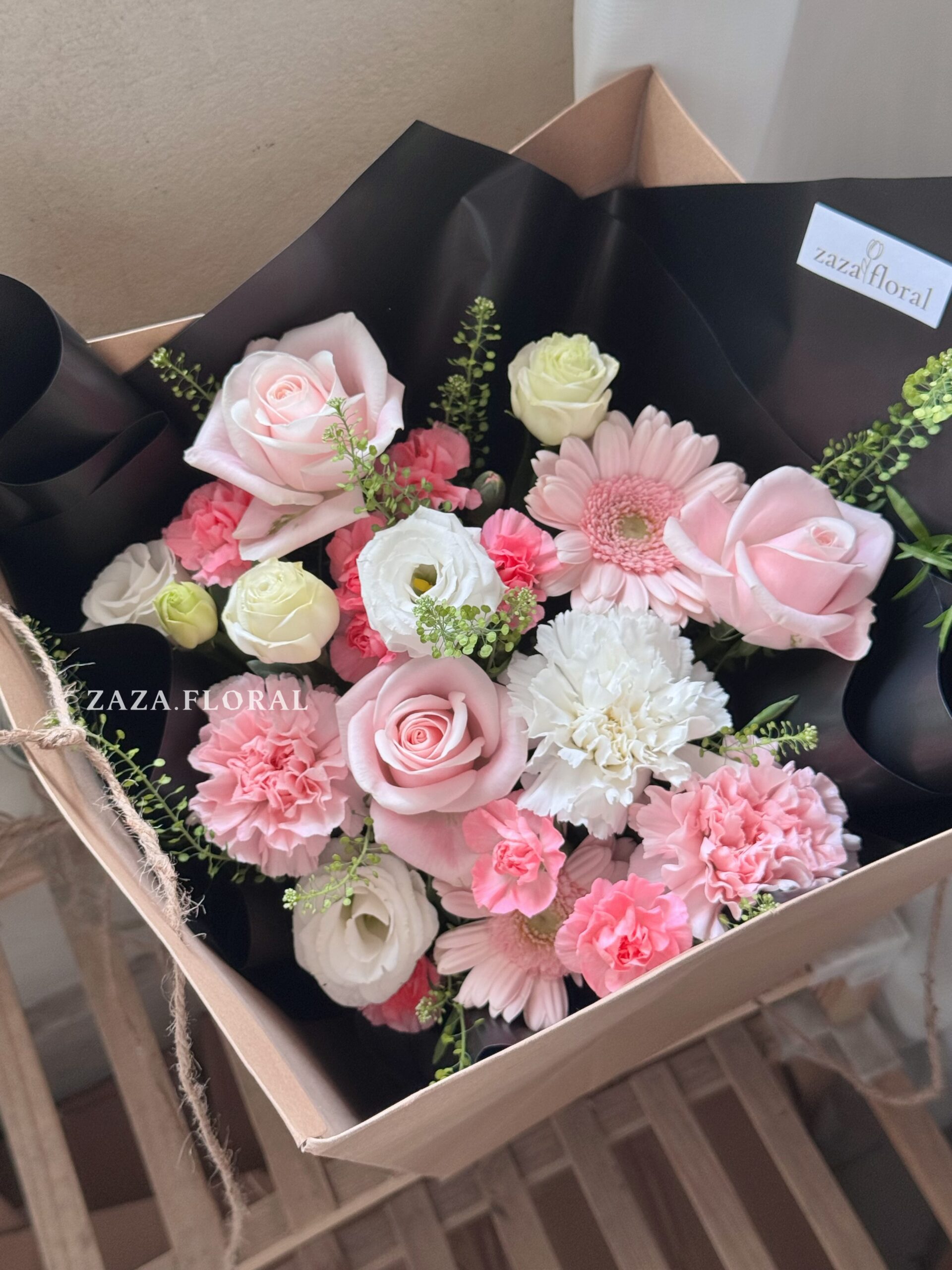 Bó hoa mang phong cách hiện đại và trung tính, nổi bật với giấy gói đen freestyle cá tính, phù hợp với mọi giới tính và nhiều hoàn cảnh tặng khác nhau. Tone đen tối giản giúp làm nổi bật màu sắc tự nhiên của hoa, tạo cảm giác tinh tế, mạnh mẽ nhưng vẫn đủ mềm mại và gần gũi.