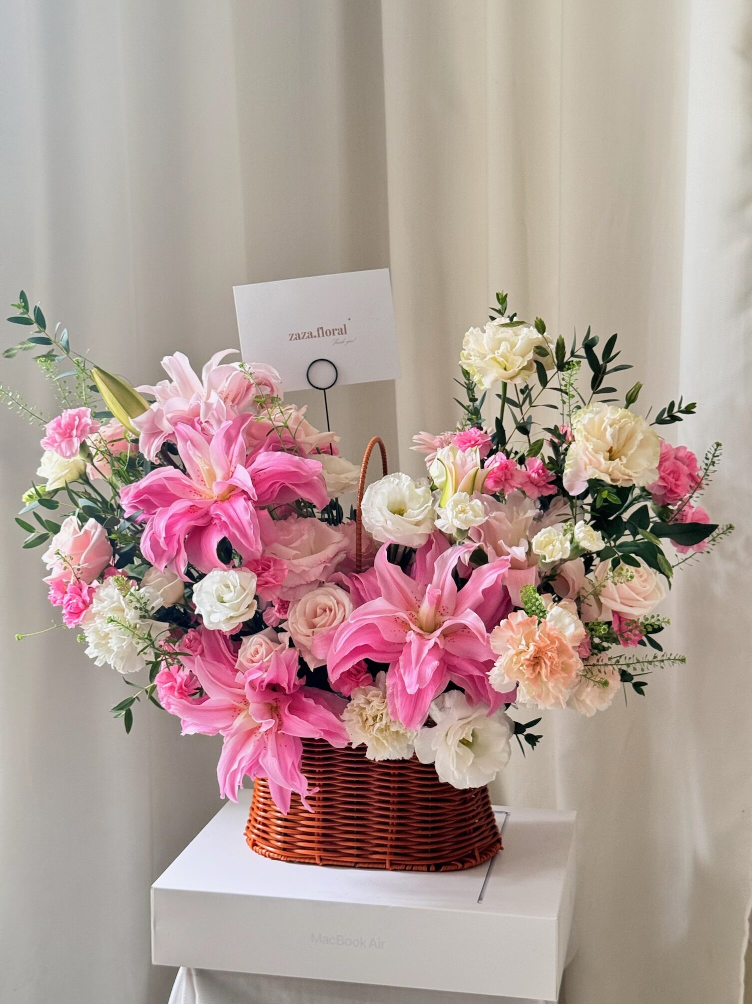 Giỏ hoa ly kép mix tone hồng trắng là sự kết hợp hài hòa giữa những bông ly kép hồng nổi bật, hoa hồng pastel mềm mại và cẩm chướng trắng – hồng dịu nhẹ. Từng bông hoa được sắp xếp khéo léo trong giỏ mây nâu ấm, tạo nên cảm giác tự nhiên nhưng vẫn sang trọng và chỉn chu.