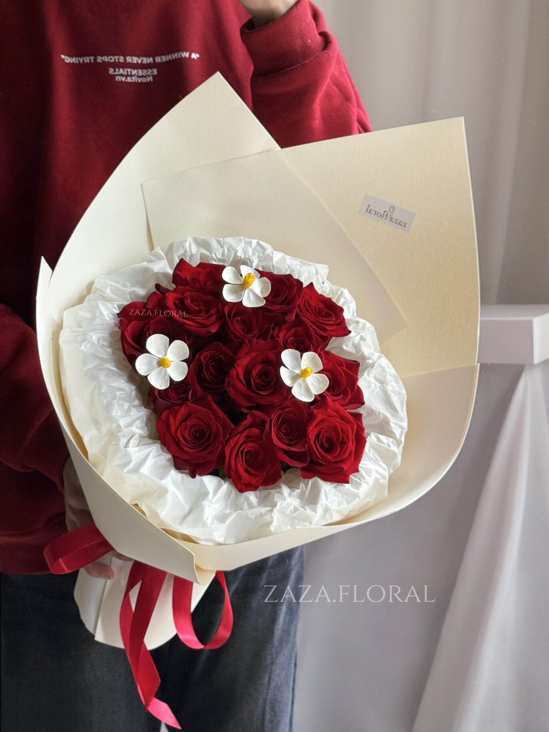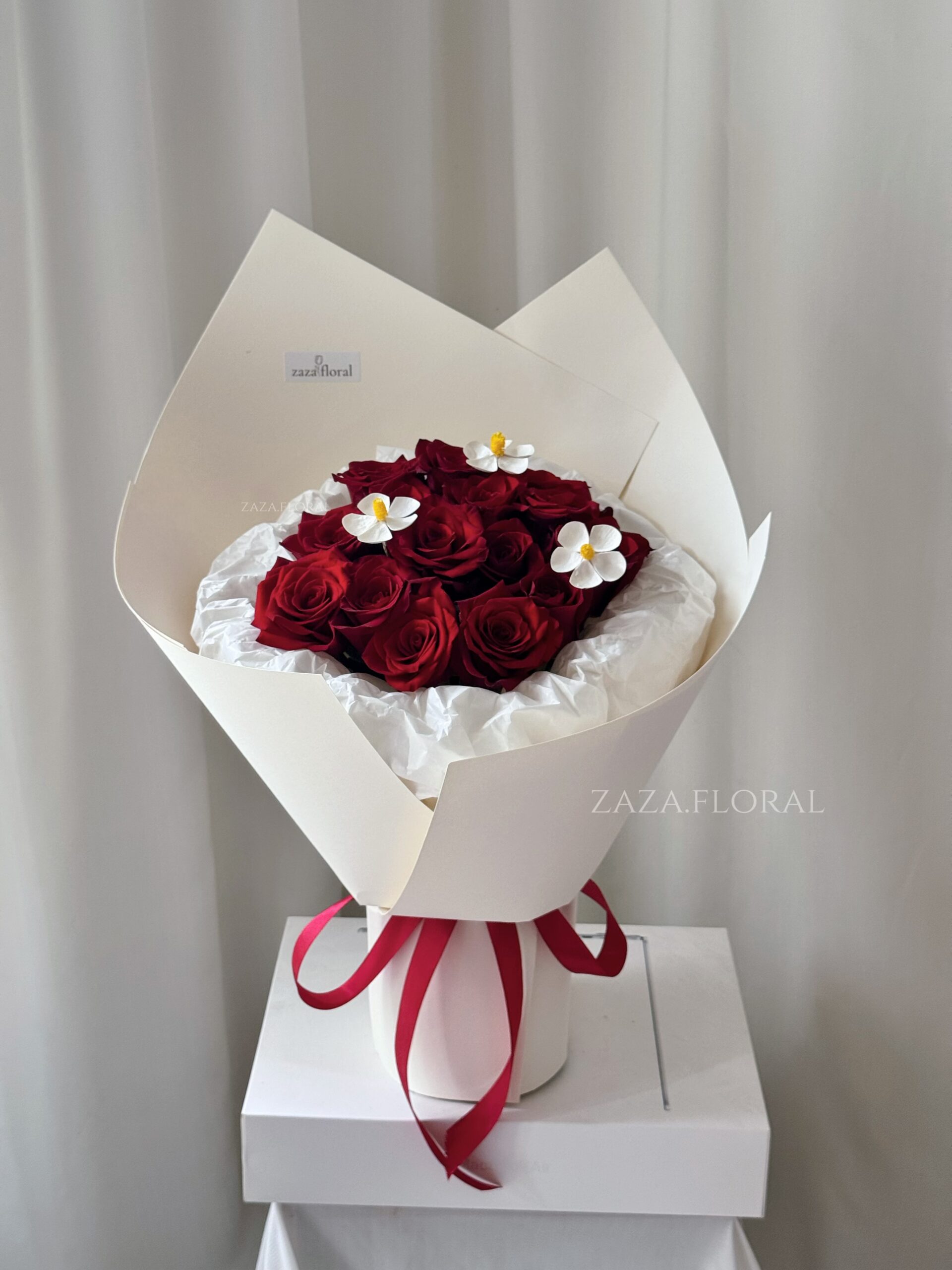 Bó hoa mang vẻ đẹp cổ điển nhưng vẫn rất tinh tế, nổi bật với hoa hồng đỏ được sắp xếp tròn đầy, đều đặn và dày dặn. Những bông hồng nhung đỏ thẫm tượng trưng cho tình yêu nồng nàn, sự chân thành và cảm xúc sâu sắc. Điểm xuyết giữa bó hoa là những bông cúc gỗ (hoa khô) xinh xắn, tạo điểm nhấn nhẹ nhàng, giúp tổng thể trở nên hài hòa và thanh thoát hơn.