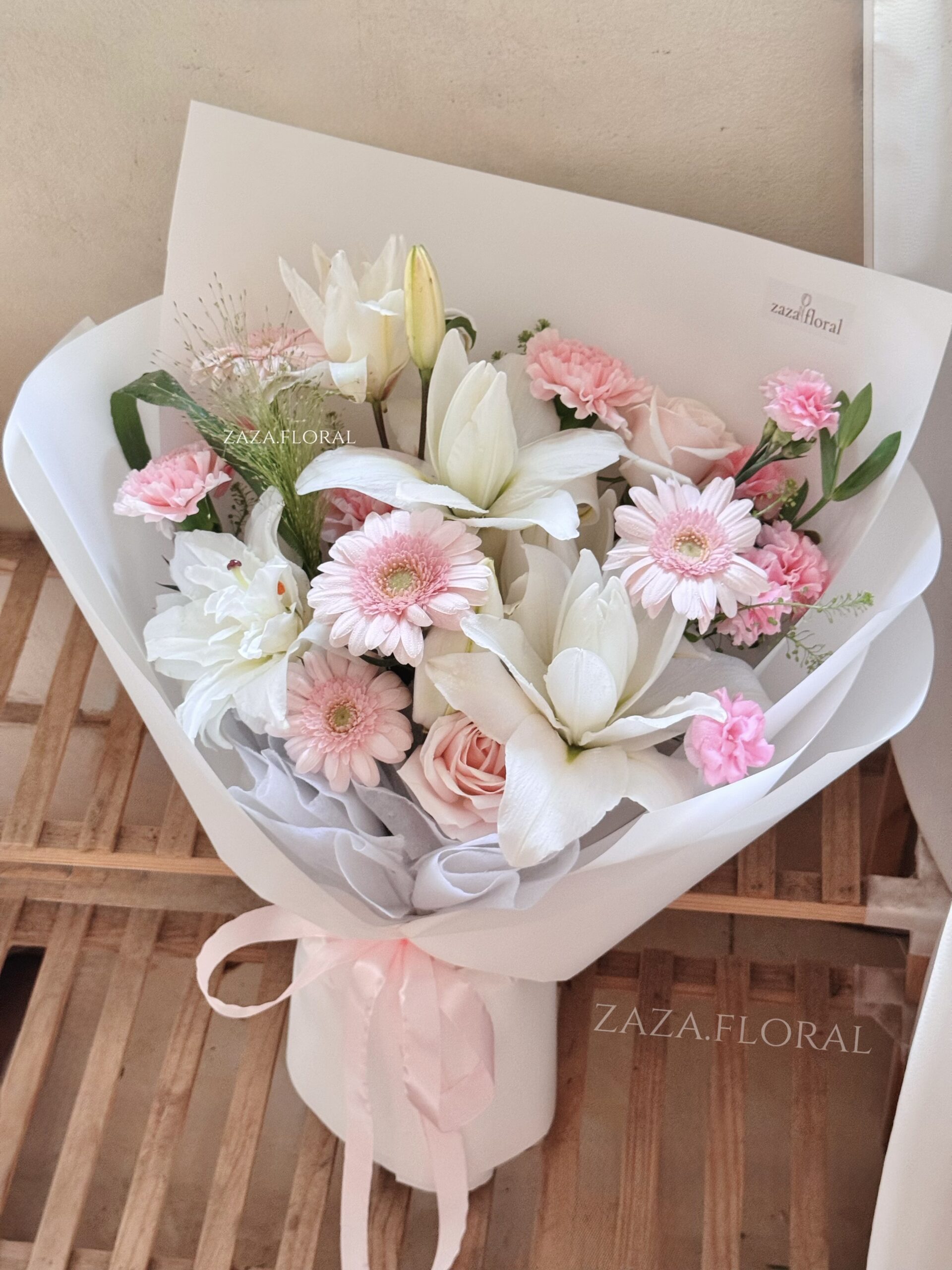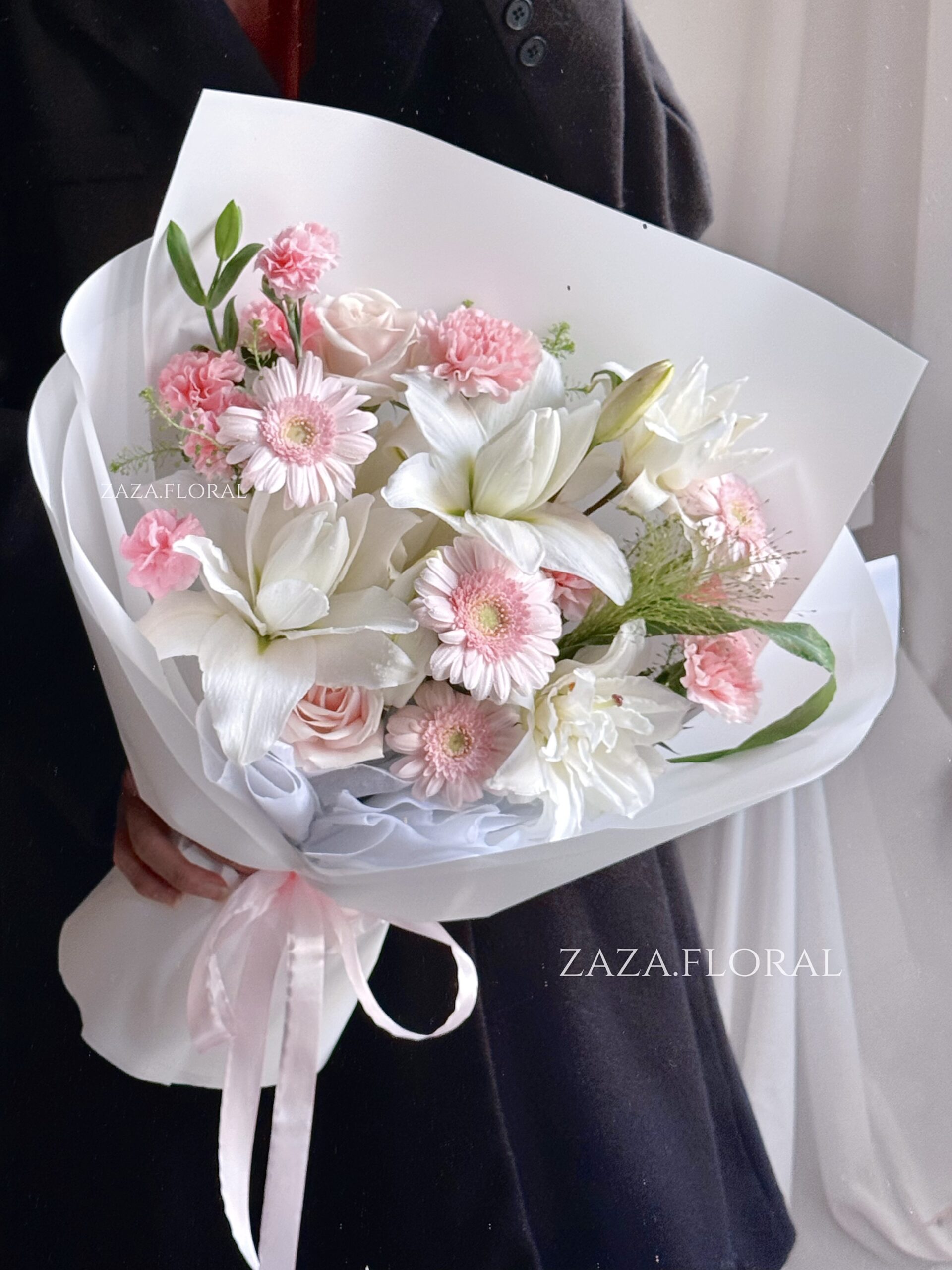 Các loại hoa còn lại được mix linh hoạt theo ngày, lựa chọn kỹ lưỡng để luôn đảm bảo đúng tone trắng – hồng pastel, mang lại cảm giác tự nhiên, mới mẻ nhưng vẫn giữ được tinh thần thiết kế ban đầu. Bó hoa được gói bằng giấy trắng mềm mại, phối lụa nhẹ và nơ hồng nhạt, tạo nên vẻ ngoài thanh thoát, tinh tế.