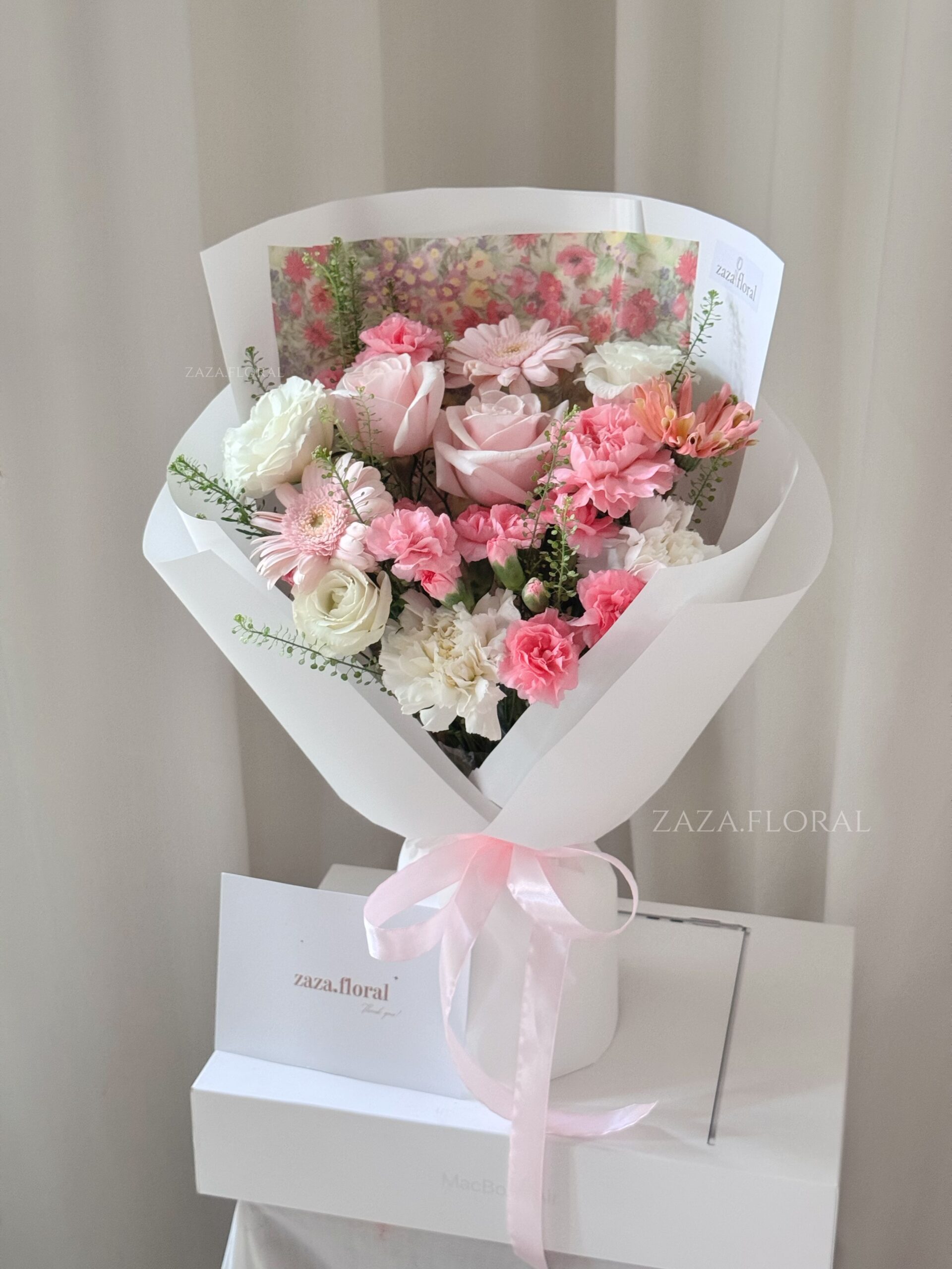 Bó hoa được gói bằng giấy trắng lỳ, kết hợp lớp giấy họa tiết hoa nhí bên trong và nơ hồng pastel mềm mại, mang lại cảm giác thanh lịch, nhẹ nhàng mà không cầu kỳ.
