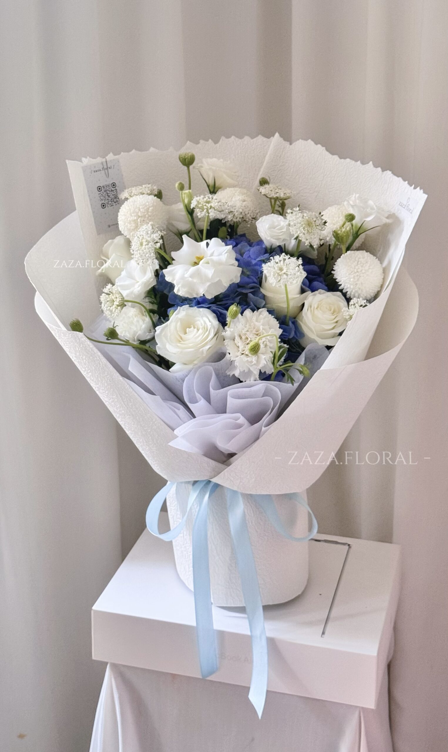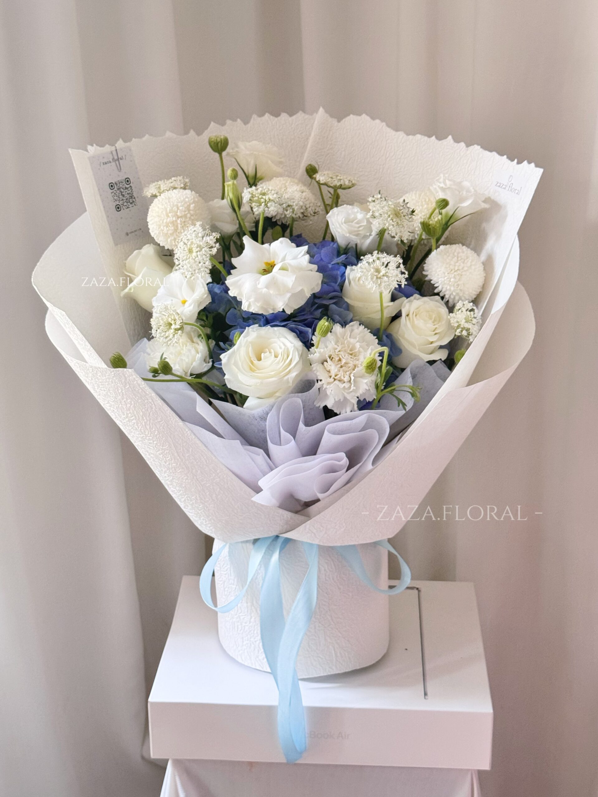 Bó hoa mang vẻ đẹp dịu dàng và thanh thoát, lấy tú cầu xanh dương làm điểm nhấn chính. Những chùm tú cầu tròn đầy với sắc xanh mát lành gợi cảm giác bình yên, tin tưởng và sự quan tâm chân thành. Kết hợp cùng cúc pingpong, hoa thúy châu trắng tròn xinh, bó hoa trở nên cân đối, nhẹ nhàng và có chiều sâu hơn trong tổng thể.